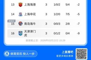 体育资讯03月22日讯 2026赛季中超第3轮比赛全部完赛,3轮过后仍有国安、海港、申花等6队负分,其中海牛和津门虎2队仍0胜,排在积分榜末。